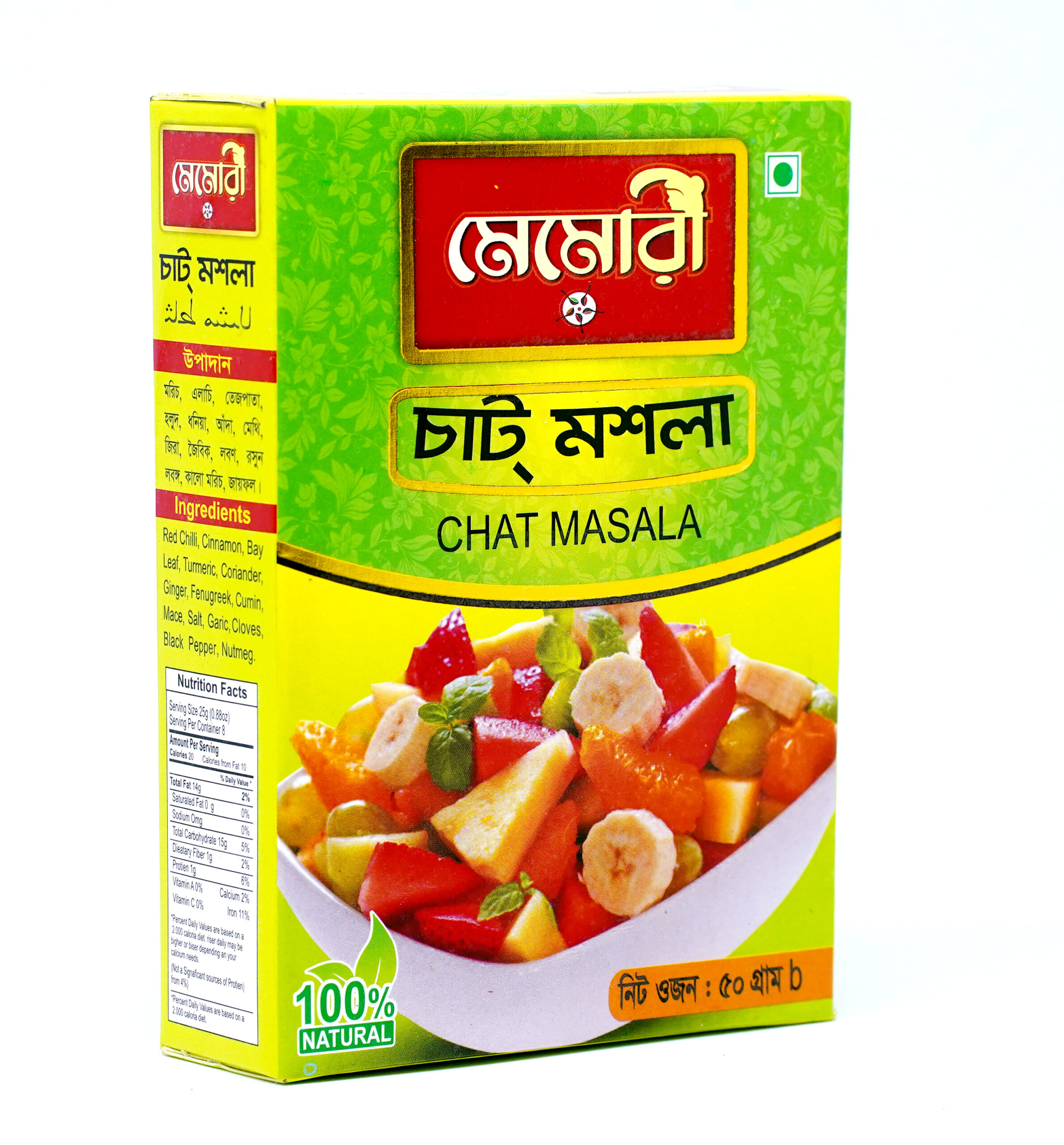 মেমোরি চাট মসলা হলো একটি স্পেশাল স্পাইস ব্লেন্ড, যা আপনার প্রতিটি চাট, ফল, সালাদ, ডাল বা পানীয়কে করে তোলে আরো প্রাণবন্ত ও মশলাদার! এতে রয়েছে বেছে নেওয়া দেশীয় মশলার নিখুঁত সংমিশ্রণ— লাল মরিচ, দারুচিনি, তেজপাতা, হলুদ, ধনে, মেথি, জিরা, জয়ত্রী, জয়ফল, রসুন, লবঙ্গ ও আরও অনেক কিছু।