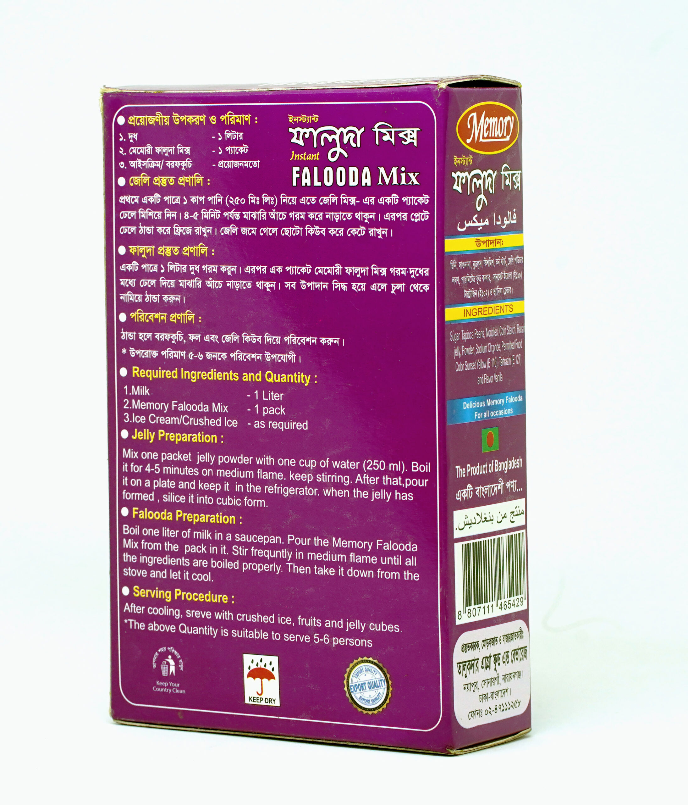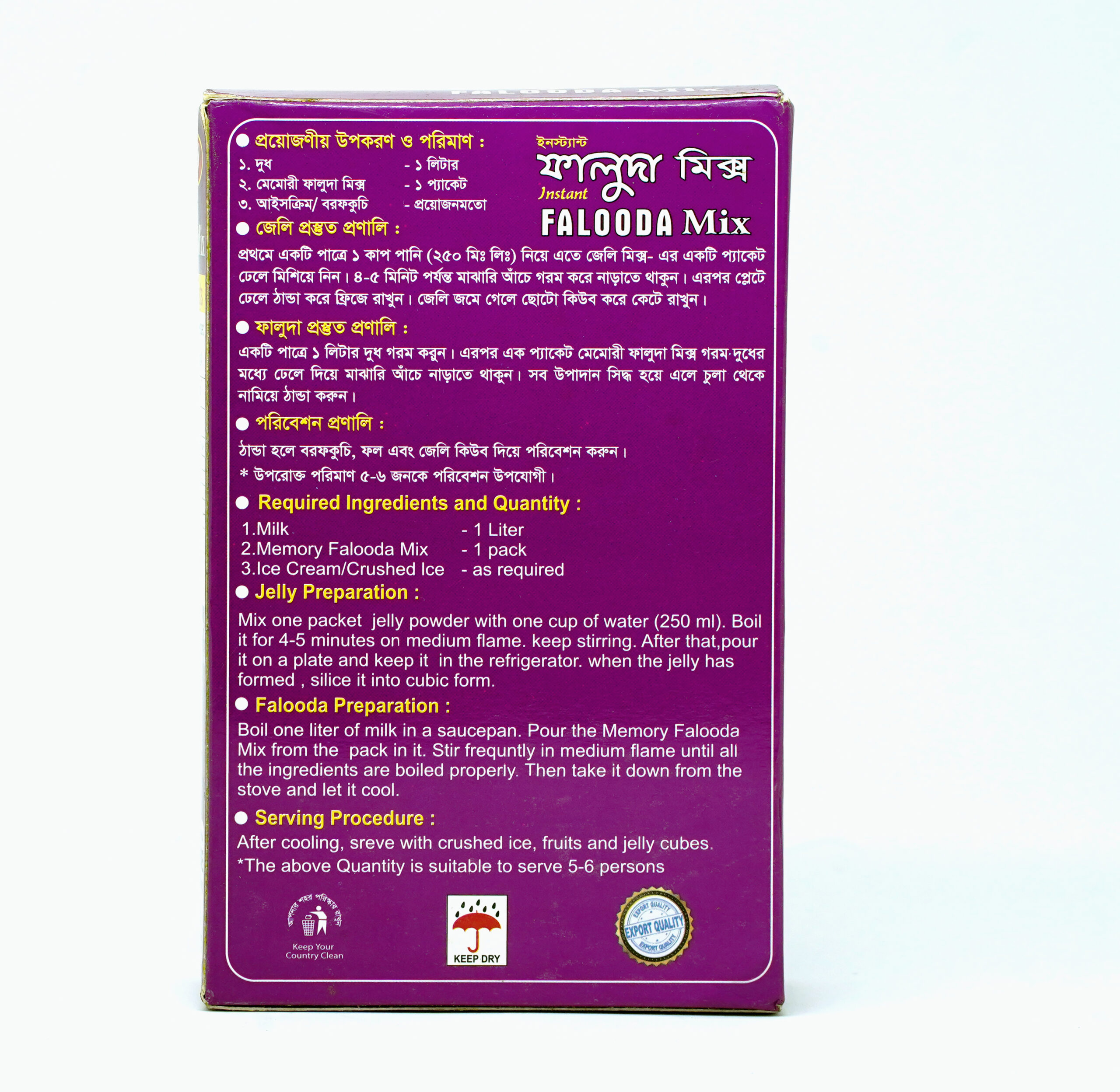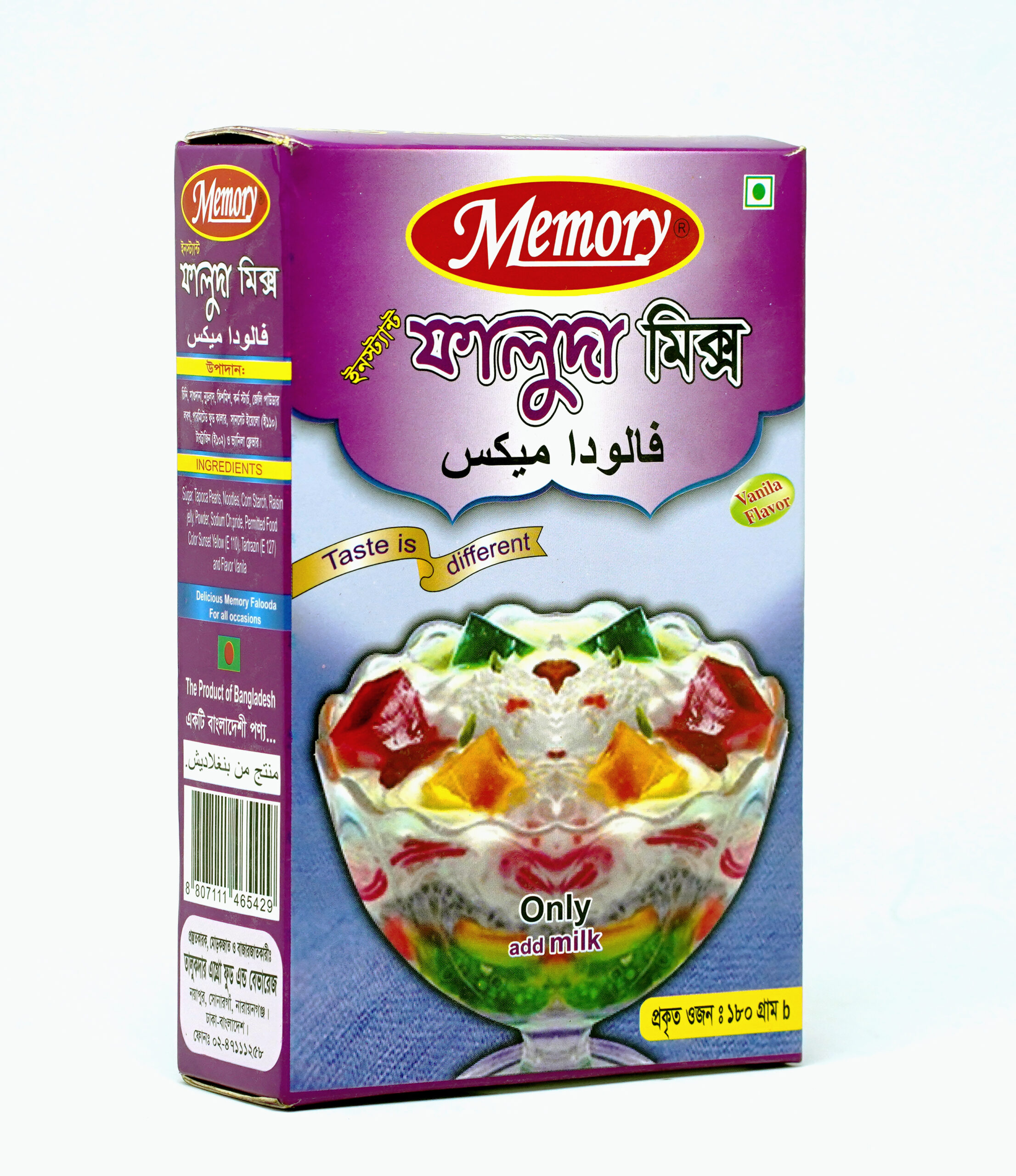 মেমোরি ফালুদা মিক্স এমন একটি প্রিমিয়াম পানীয় মিক্স, যা তৈরি হয়েছে যত্নসহকারে নির্বাচিত উপাদানে। এতে রয়েছে সুগন্ধযুক্ত ভ্যানিলা ফ্লেভার, মজাদার জেলি, সাগুদানা , নুডলস, রেইজিন এবং কর্ন স্টার্চের মতো উপাদান যা দুধে মিশলেই তৈরি হয়ে যায় রেস্টুরন্ট-স্টাইলের ঠাণ্ডা ফালুদা!