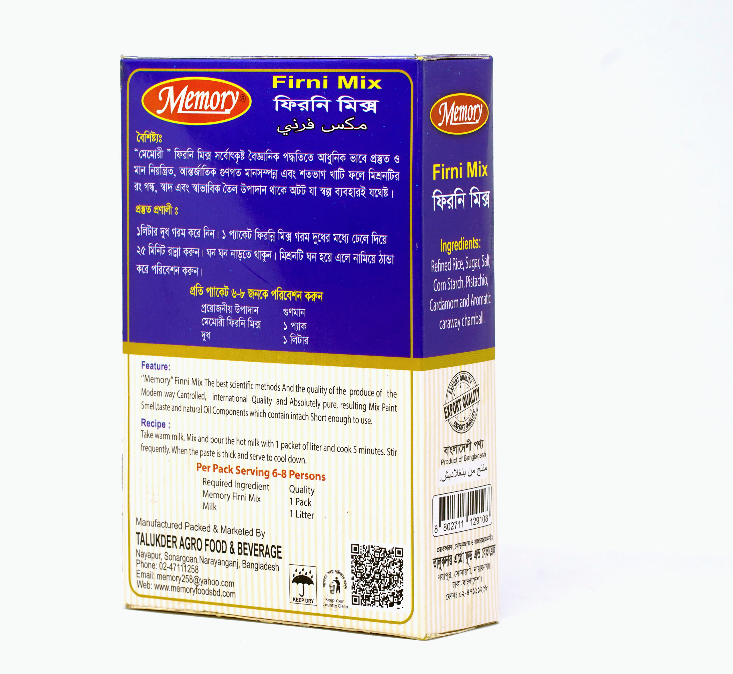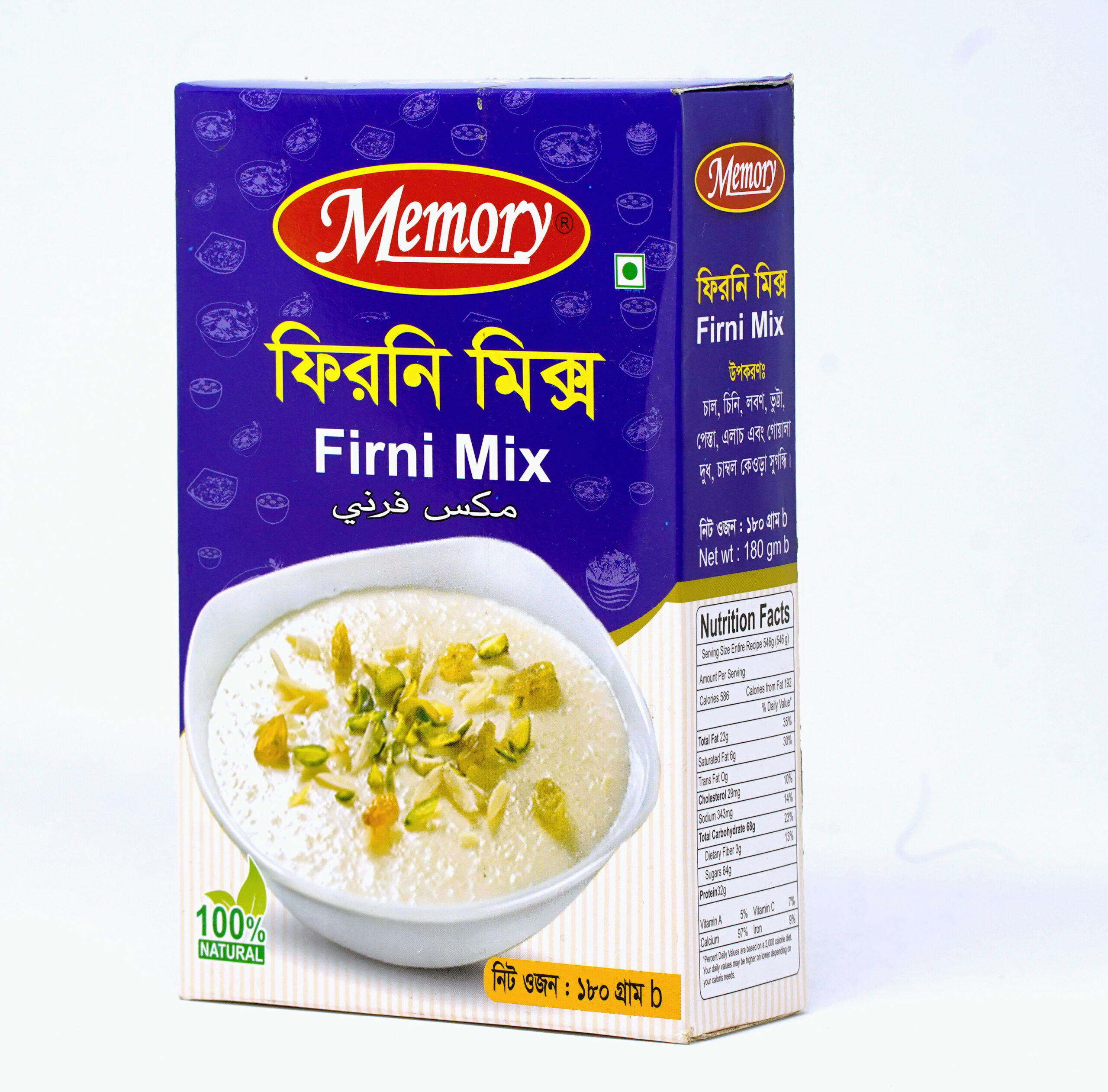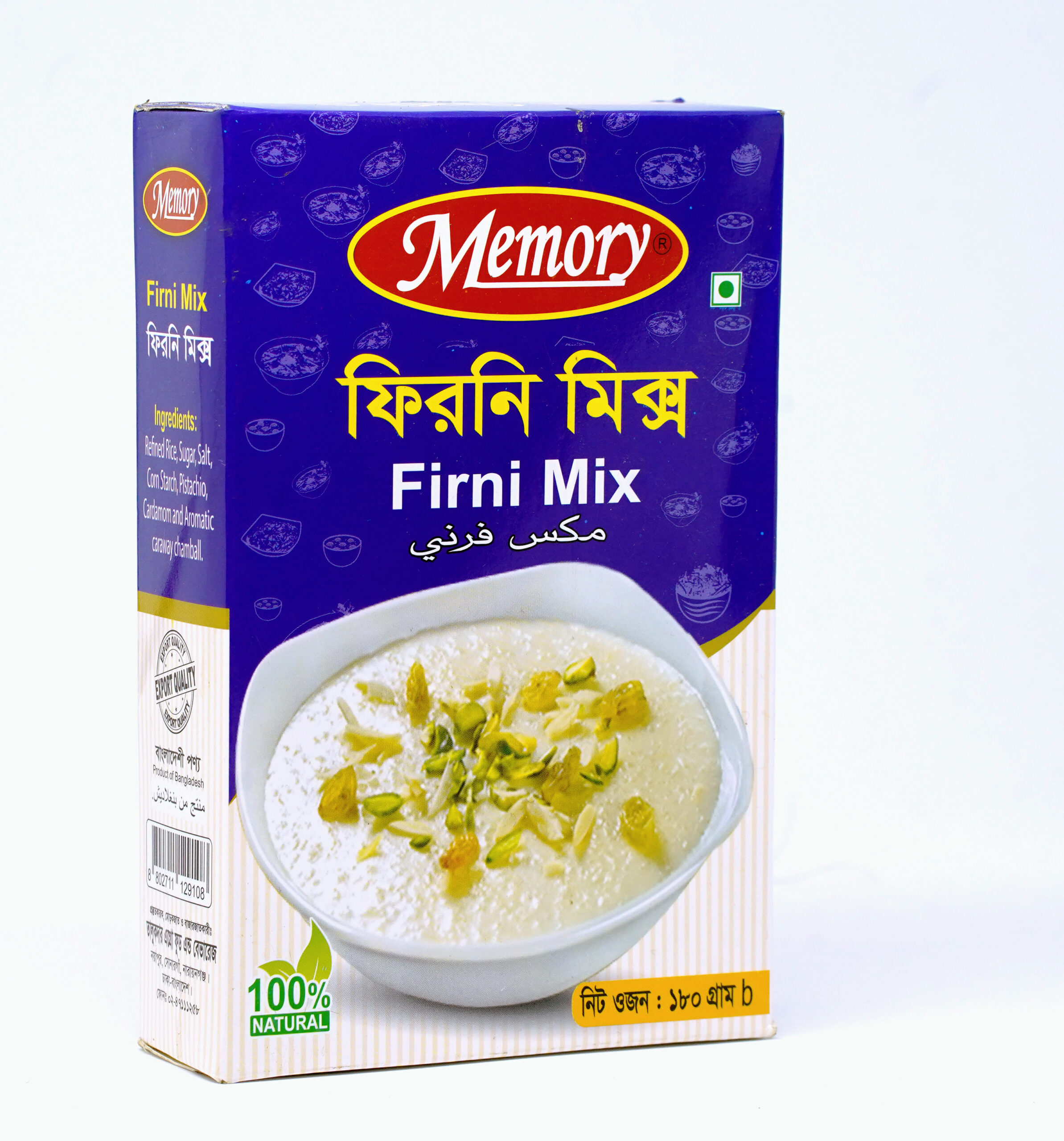 মেমোরি ফিরনি মিক্স নিয়ে এসেছে সঠিক পরিমাণে মাপা উপাদানে তৈরি একটি প্রিমিয়াম রেডি-টু-কুক প্যাক। এতে রয়েছে পরিশোধিত চাল, পিসতা, এলাচ, কর্নস্টার্চ ও সুগন্ধি যা দুধে রান্না করলেই তৈরি হয় ঘন, মোলায়েম ও সুগন্ধযুক্ত ফিরনি।