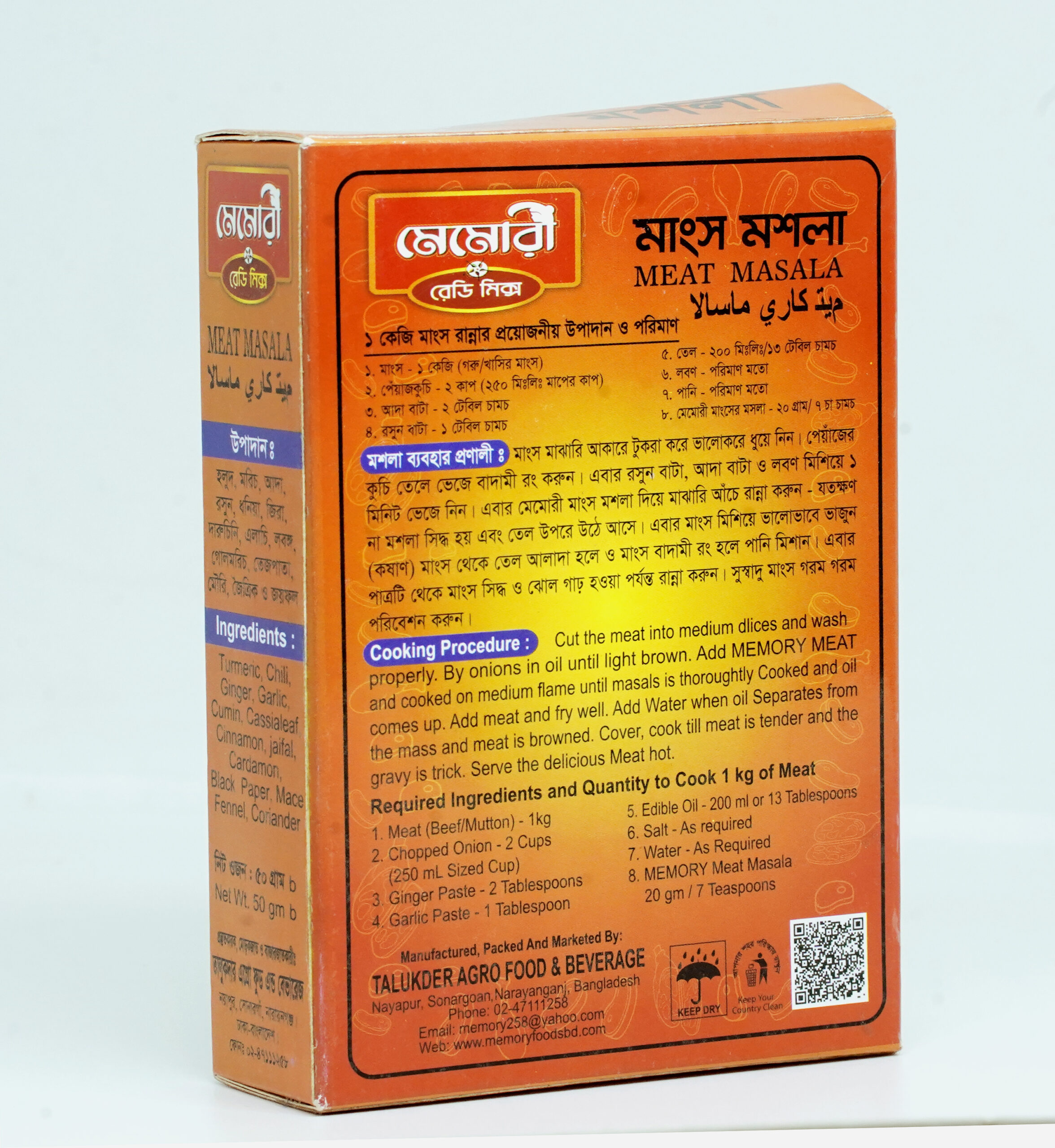মেমোরি মিট মাসালা তৈরি হয়েছে প্রিমিয়াম গুণগত মানের হলুদ, মরিচ, আদা, রসুন, জিরা, তেজপাতা, দারুচিনি, জয়ফল, এলাচ, গোলমরিচ, জয়ত্রী, ধনে ইত্যাদি প্রাকৃতিক মশলার নিখুঁত মিশ্রণে। এই মাসালাটি মাংসের প্রতিটি টুকরোতে ছড়িয়ে দেবে গরম ঝাঁঝালো স্বাদ ও সুমধুর ঘ্রাণ।
