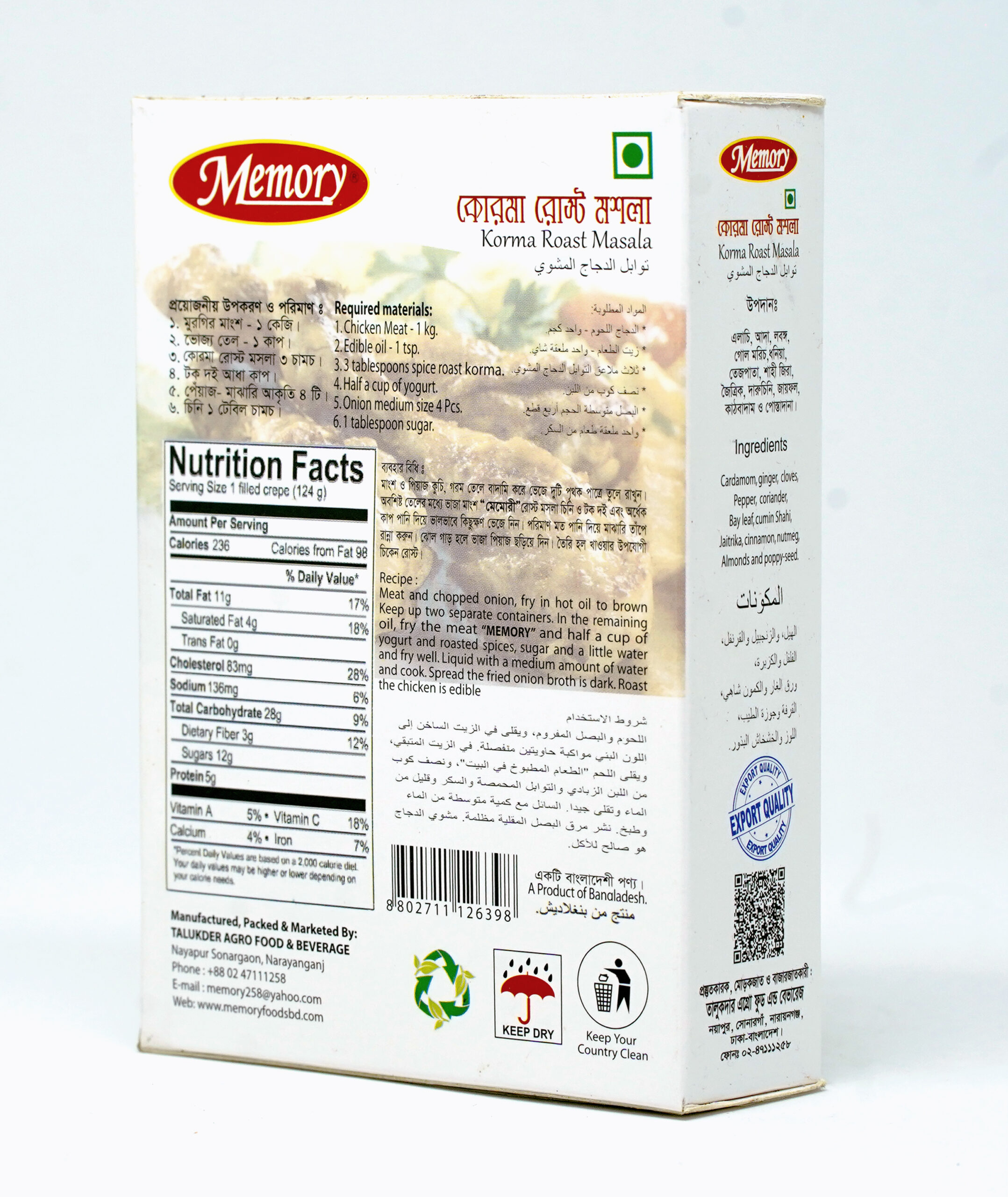 আমাদের রোস্ট মাসালা তৈরি করা হয়েছে সেরা মানের কার্ডামম, আদা, লবঙ্গ, গোলমরিচ, ধনে, তেজপাতা, জিরা শাহী, জলত্রিকা, দারুচিনি, জয়ফল, বাদাম ও খসখস বীজের মিশ্রণে। প্রতিটি উপাদান সাবধানে রোস্ট করে এই মাসালাটিতে ঝরবে ঘন ঘন ঘ্রাণ ও অসাধারণ স্বাদ।
